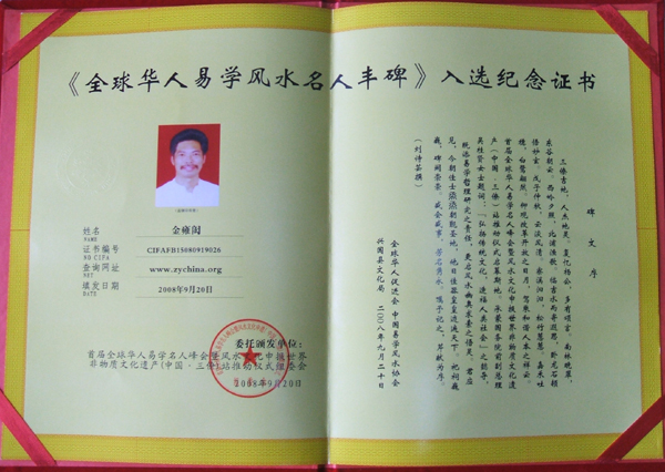 金雍闳入刻江西三僚村“全球华人易学风水名人丰碑” 2008年9月在江西兴国县三僚村召开了“中国风水文化申遗推动仪式第二站”大会,并在杨公祠前竖立了一块全球华人易学风水名人丰碑,上碑的共有来自世界各国华人易学风水名人100人,金雍闳名列其中,并排名第十四名。